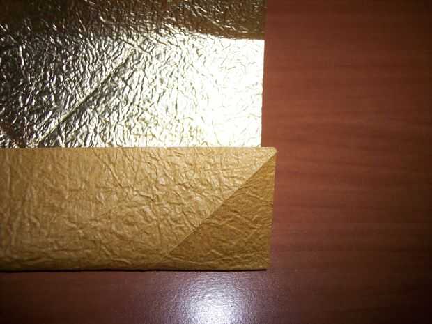 Toma el borde inferior y pliegue a pliegue de la marca en el medio. Marque con un pliegue en los bordes externos. Hacer esto para los otros tres bordes.