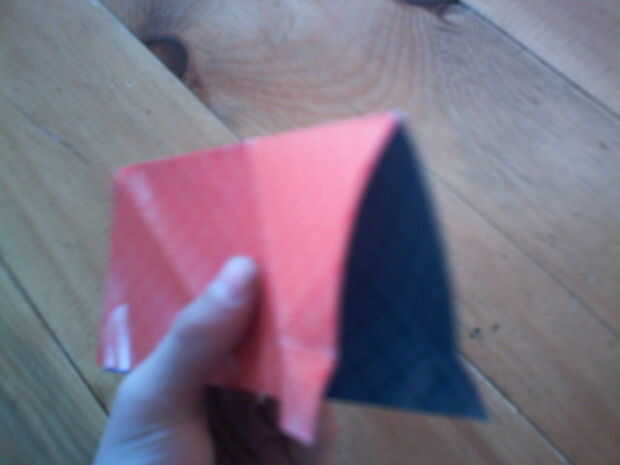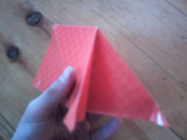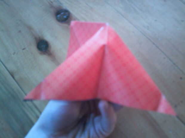 Sostener el papel como se muestra en la primera foto. En la esquina superior derecha, comienza empujando hacia abajo. Usted debe terminar con la segunda foto. Terminar empujando y luego arrugan. Debe tener dos aletas abiertas.