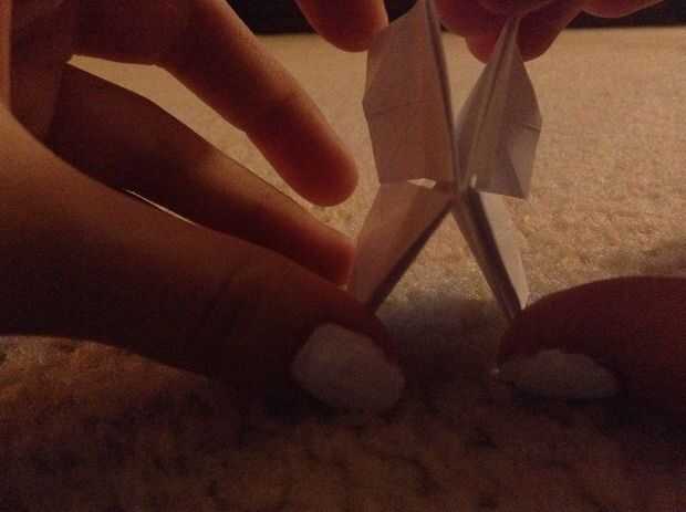 se necesita:-tijeras-una hoja de origami de 15cmx15cmPaso 1: Base Doblar las diagonales. Pellizcar el papel y doblar las esquinas dentro.Paso 2: Cuerpo de la mariposa Doblar la parte superior un poco sobre el borde. Dé vuelta. Abrir la tapa superior