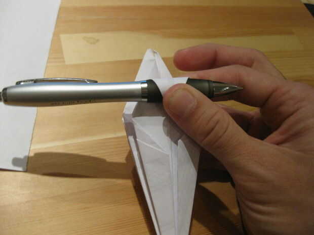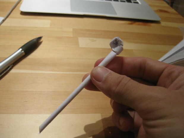 7. Tome la tira larga y enróllelo firmemente y en diagonal para que tenga un palo largo