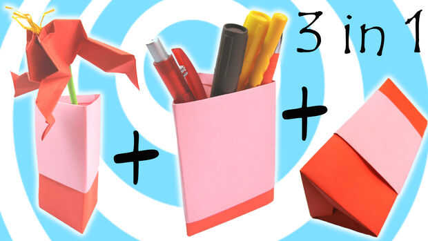 Aprender cómo hacer un florero de origami de papel, pluma o portalápices y caja de regalo de papel (3 modelos en 1 tutorial).
