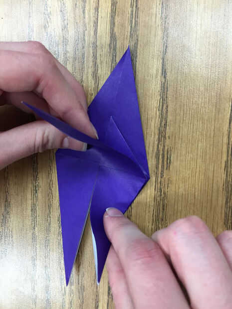 Su papel doblado debería verse como un diamante. Gratis dos "piernas" forman la parte inferior de la mitad de su diamante. Cada pierna debe tener una aleta superior e inferior. La mitad superior de su diamante debe tener dos "alas" con un pequeño triangular "cuerpo" entre ellos.