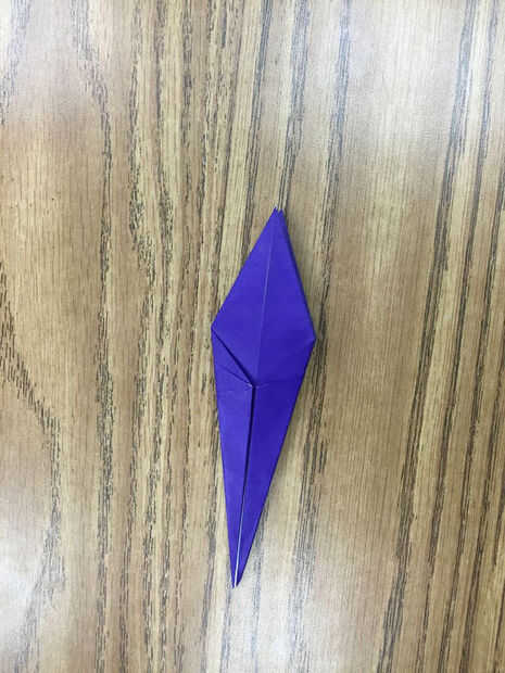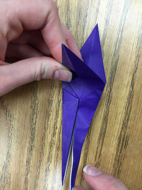 Voltee el papel y repita este proceso con las aletas en el otro lado (Foto 3). Ahora debe tener una forma de cometa. Una vez más, la parte inferior de la cometa debe ser dos piernas. La parte superior debe ser dos alas con un cuerpo más pequeño entre ellos (foto 4).