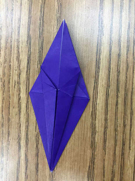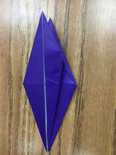 Coloque el diamante con las piernas hacia usted y las alas hacia arriba. Doblar el borde exterior de la solapa superior de la pierna derecha hacia el centro (Foto 1). Repetir este proceso con la solapa superior de la pierna izquierda (Foto 2).
