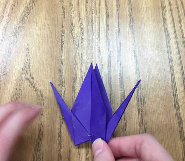 Repetir el mismo proceso para la otra pierna formar la cola. Hacer un pliegue doblando la pierna izquierda a un ángulo de 45 grados en ambas direcciones. Luego invierta la tapa para que la pierna se termina entre las alas.