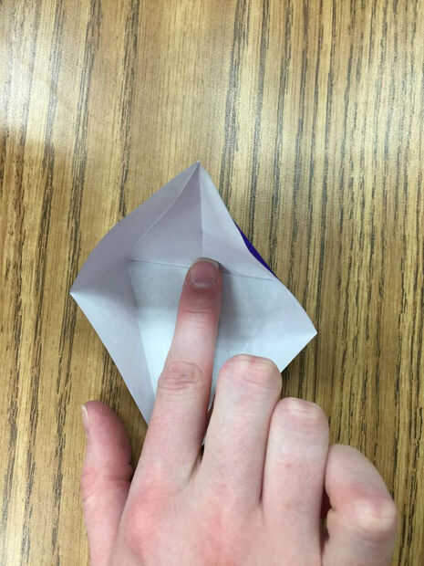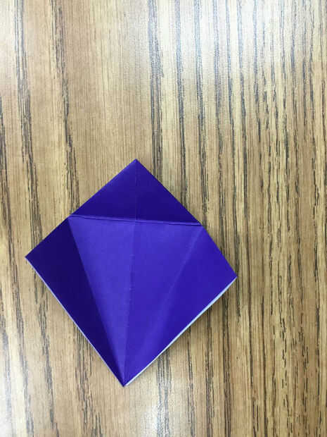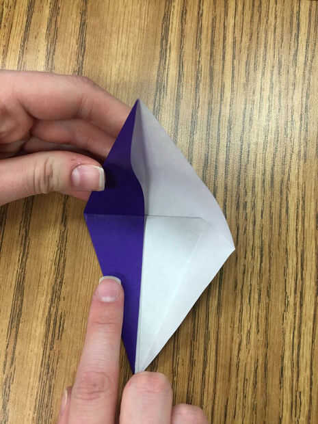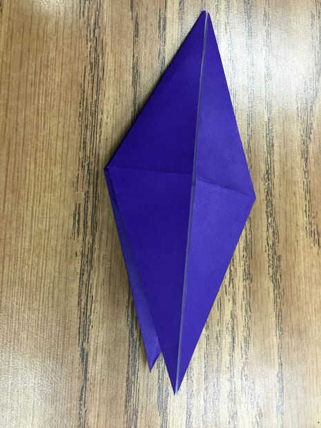 Voltee el papel y repita este proceso en el otro lado. Despliegan sus aletas y levantar la capa superior del papel. Mantenga pulsado el pliegue que hizo en el paso siete con el dedo. Doblar los bordes derecho e izquierdos del papel en hacia la línea central para formar un diamante (foto 4).