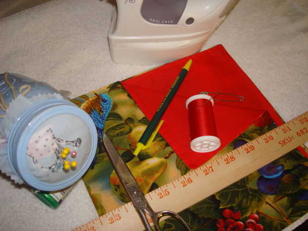 2 telas de contraste (1/2 yarda cada corte en cuadrados de 18 pulgadas y cosidos juntos.) Use una servilleta forrada contrastante o bufanda.