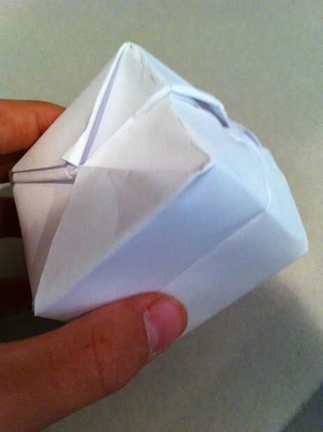 ¿Ahora, ver que la ranura pequeña subiendo desde el centro del hexágono en la segunda foto? Seguir que la ranura hasta la parte superior del hexágono. Verá un pequeño agujero en la parte superior del hexágono. Soplar a través de él. Debe inflar y convertirse en un cubo no-tan-perfecta. Pellizque suavemente a lo largo de los bordes del cubo para conseguirlo buscando agradable y fuerte. Debería verse como el cubo en la tercera foto.