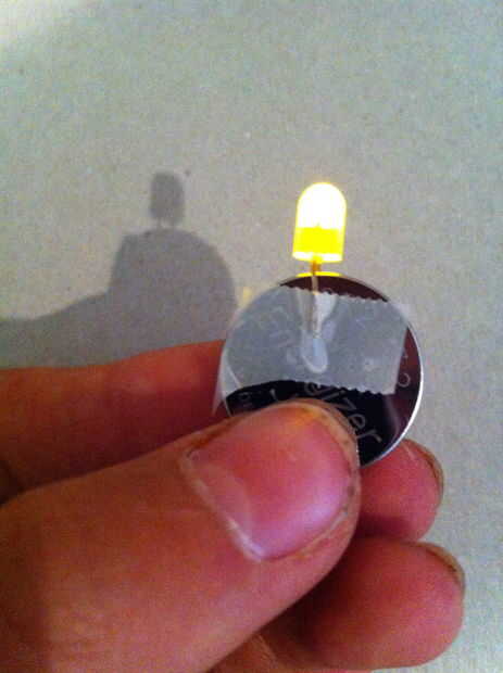 Si te fijas bien en la batería de botón, verá un "+" en el lado más suave de la batería. Positivo de los LEDs a ese lado de la cinta. El cable negativo al lado opuesto de la cinta. El LED comienza a brillar (como se muestra en la primera foto).