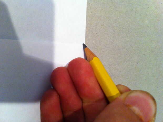 En primer lugar, toma una esquina de la página (llamaremos a esta esquina 1) y llevarlo hacia arriba al borde opuesto de la página para formar un triángulo rectángulo perfecto (como se muestra en la primera foto). Marque un punto de esquina 1 es donde ahora (como se muestra en la segunda foto). Deje 1 esquina volver a donde estaba antes y luego repetir este proceso una vez más con la esquina que ahora está más cerca de la esquina 1 (llamaremos a este 2 esquina).