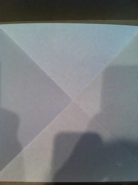¿Recuerda esquina 1 y 2? Bien, usted necesita traer 1 esquina a través de la página al punto que usarlo. Luego doblar. Hacer la misma cosa para esquina 2. Ahora debe tener una X cruzar el papel cuadrado (como se muestra en la primera foto).