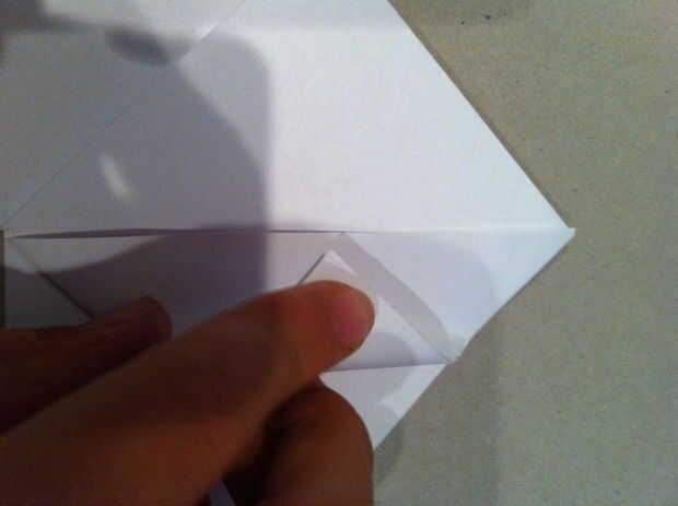 Tomar las esquinas izquierda y derecha del diamante que acaba de hacer y doblarlas en el centro del diamante (como se muestra en la primera foto). El diamante debe ser ahora un hexágono.