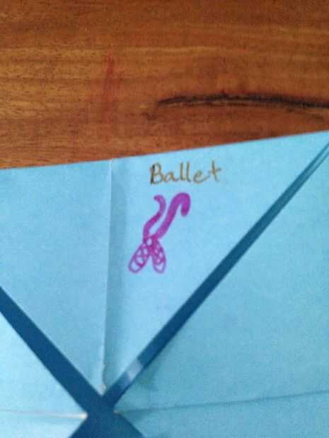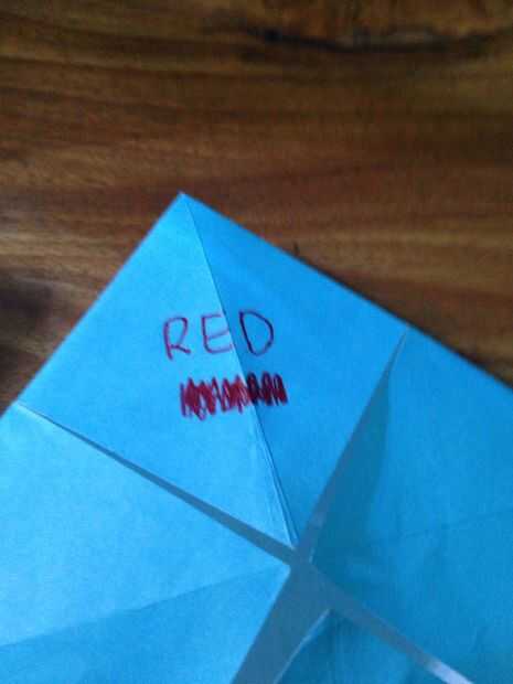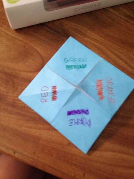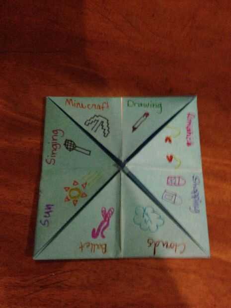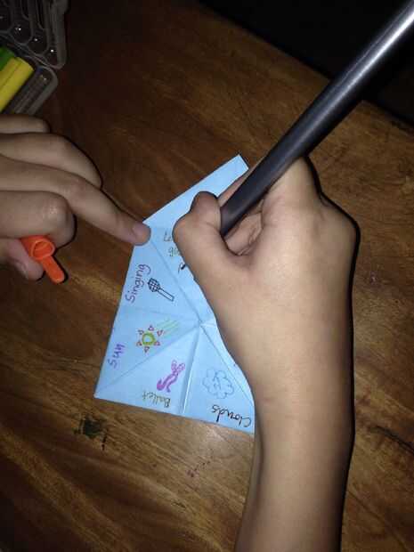 Para un adivino empezaremos en el exterior. Así que sus plumas y el color del color que vas a poner en el exterior. Por ejemplo, rojo. Escritura roja y color rojo en "rojo". Llenar los otros cuadrados. Luego escribe cualquier cosa en los triángulos pequeños en el otro lado. Por ejemplo, "Ballet clásico". Luego hacer un dibujo de la cosa bajo la palabra. Luego escribes fortunas en cada cosa que escribió relacionado a él. Entonces estás listo para usar su adivino!