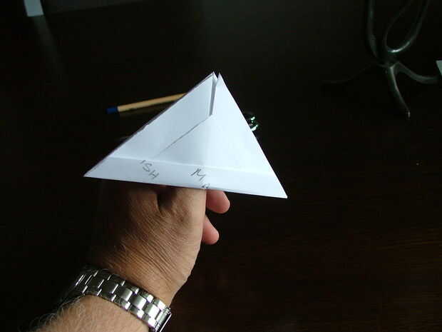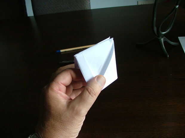 El siguiente paso es un poco confuso - así seguir las fotografías y poner el sombrero de samurai en el pulgar. Luego aplastar el sombrero hacia los lados para formar otra forma del diamante.