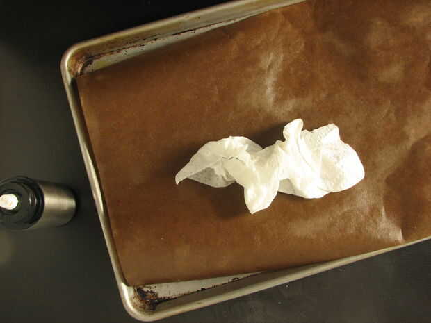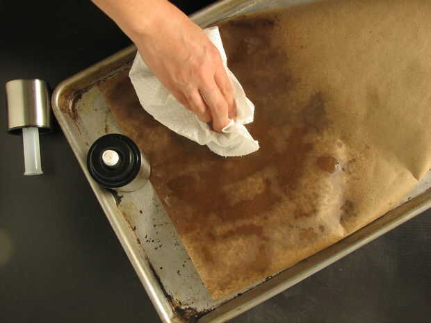 Papel marrón del aerosol con aerosol de cocina antiadherente o con un pulverizador de aceite y frote ligeramente la hoja con aceite hasta que la superficie es uniforme y saturada. Su papel será sentir menos grasa y mucho más aseada para trabajar con si usas suficiente aceite para saturar el papel, y si dejas que el aceite de reposar una hora o así antes de plegar. Si hay exceso de aceite (brillante) restante cuando quiere doblar, use una toalla de papel para secar el papel.