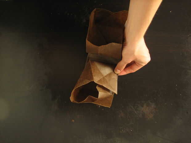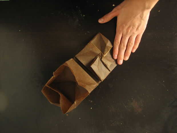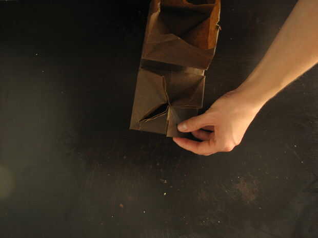 Doblar cada borde de los lados de la "bolsa de papel" hacia abajo y más a la derecha. Porque estas piezas del dispositivo de seguridad, que tendrás que desplegar y replegar para recibir a todos los de la tapa en posición horizontal. Eventualmente cada pliegue de esquina deben estar alineados con un lado de la base cuadrada. Ahora los lados se engancharán en una configuración de pinwheel.