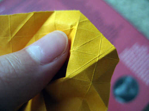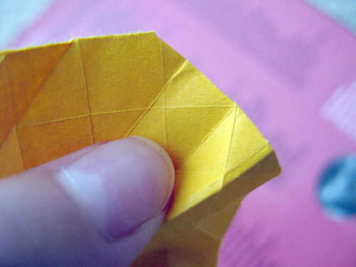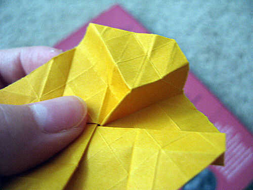 Entonces, si usted tira de uno de las aletas, verás un pliegue que va desde una esquina hacia abajo. Usted tendrá que surgir de este pliegue. Las imágenes pueden ser algo útiles para esto.