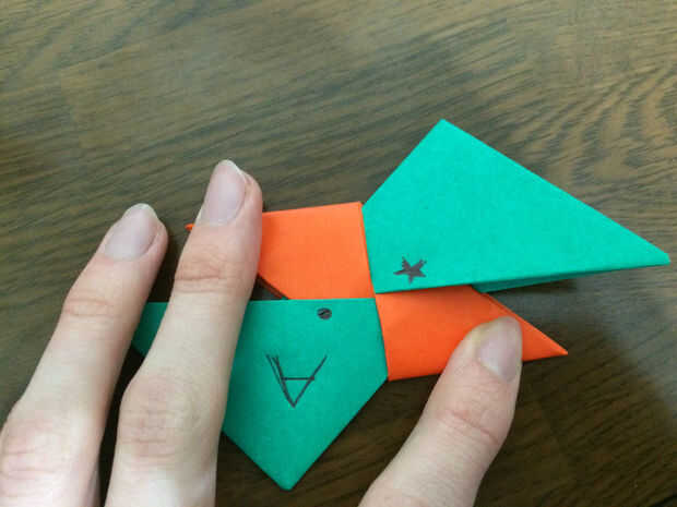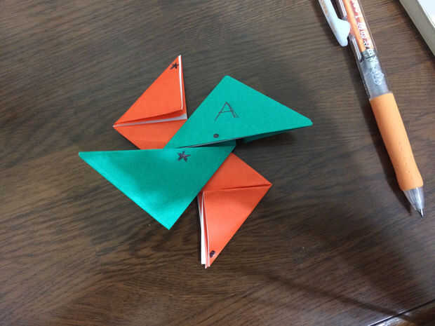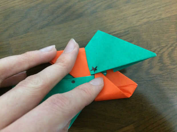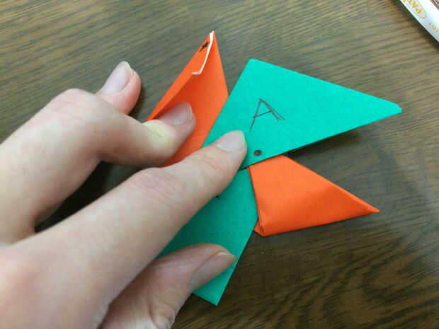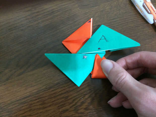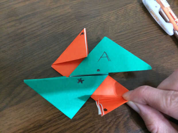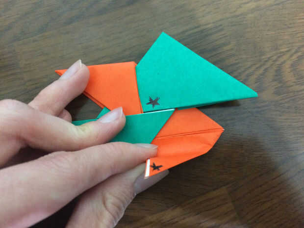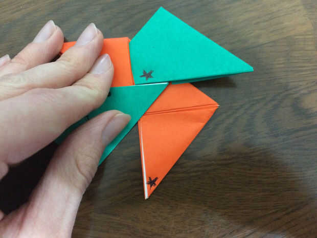 Coloque las esquinas de la pieza B por debajo de la pieza A. La primera imagen se muestra donde deben caber las esquinas, haciendo coincidir el punto el punto y la estrella con la estrella. A meter en las esquinas, doble pieza B como se muestra.