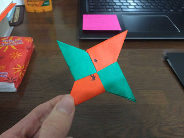 Se ha terminado de hacer un origami shuriken! Asegúrese de que todas las esquinas estén bien metidas en, o se derrumbará. Ahora que sabes cómo hacer estas estrellas ninja, hacer un puñado de ellos y tienen una pelea ninja!