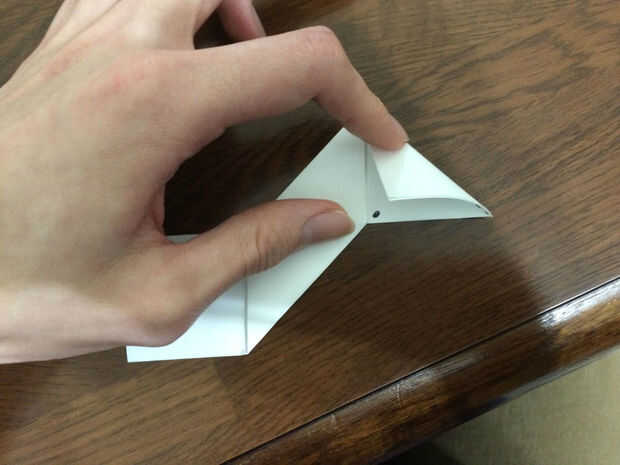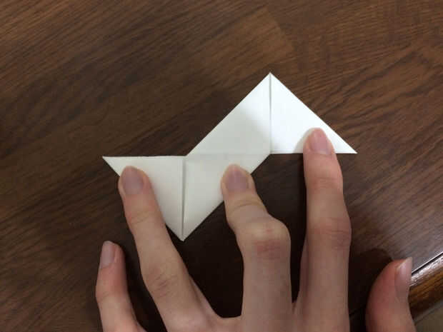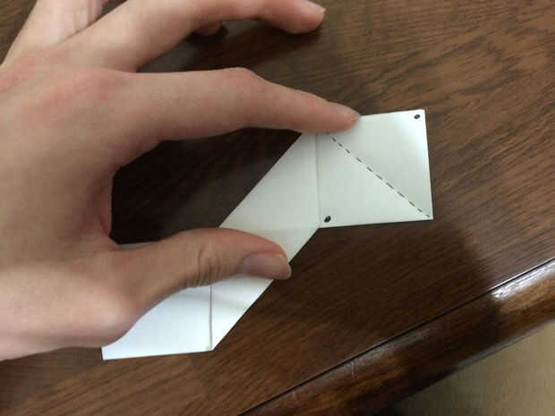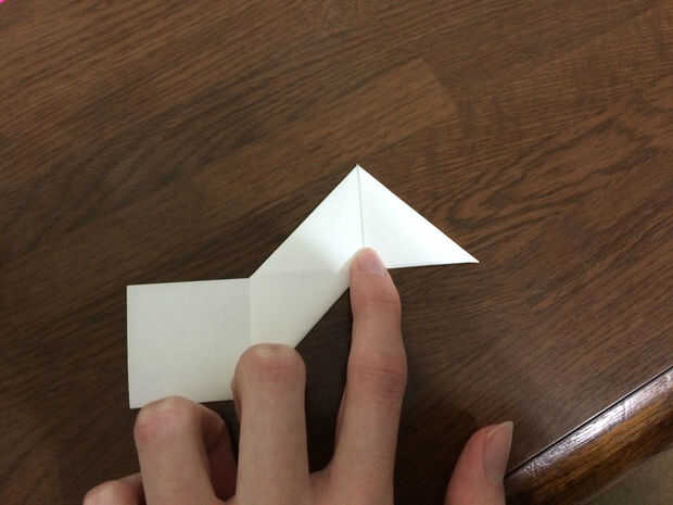 Girar sobre el papel. Debe haber dos cuadrados en los lados. Tomar la esquina superior derecha de la Plaza de la derecha y doblar en la esquina inferior izquierda. Esto crea una forma de pirámide en la parte superior. Repita el paso en la Plaza de abajo. Las imágenes muestran dos puntos donde deben cubrir las esquinas y una línea de puntos donde se hace el doblez.