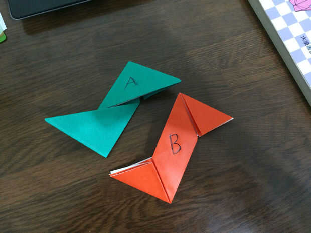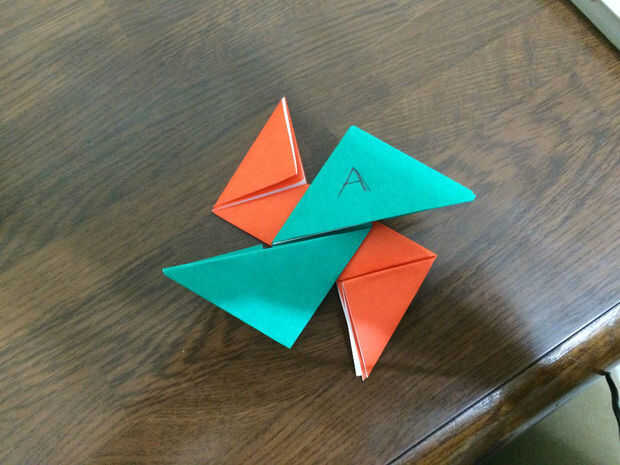 Vuelta de la pieza para que ambas piezas no aparecen del mismo lado. Los ejemplos en las imágenes se ha cambiado para ayudar a distinguir las dos piezas. Pedazo de lugar A, el lado con dos pirámides, sobre la pieza B la imagen muestra.