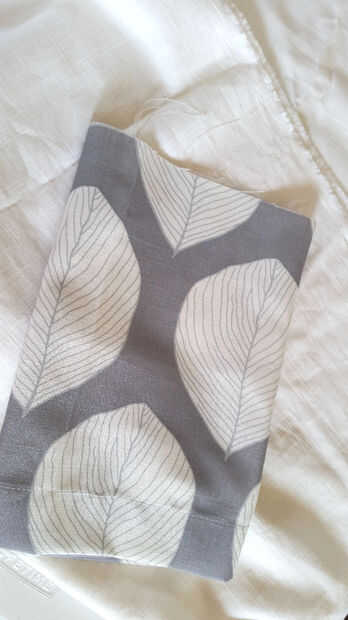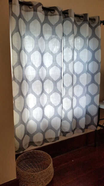 Esto es el conjunto de cortinas que he comprado para una ventana. Eran demasiado largo y colgado forma pasa el borde inferior del marco de la ventana. Después de les había dobladillado, tenía bastante de poco de tejido sobrante. El diseño parece abstracta y geométrica. Son en realidad hojas sobre un fondo gris-azul.
