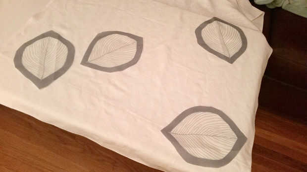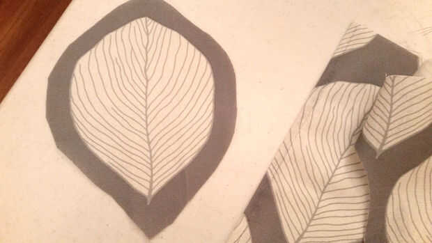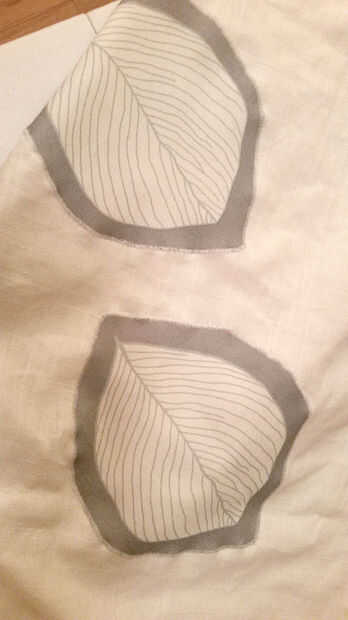 Corte cada una de las hojas individuales de todo del remanente y ponerlos al azar en los paneles por lo que parecen las hojas caen. Una vez que estaba feliz con sus posiciones, cubrió les hacia abajo y de vuelta a las máquinas de coser. Cada hoja es coser como una aplicación. El ajuste es zig-zag en todo el posible y la longitud de la puntada en el mínimo.