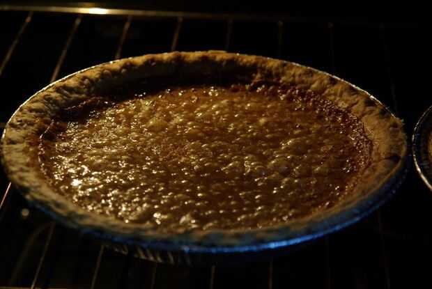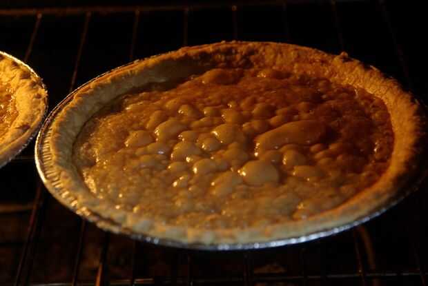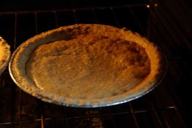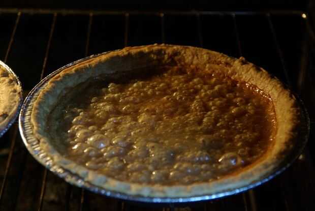 Para comprobar si el pastel es completamente cocido, empezar a comprobar en unos 45 minutos. El relleno de la empanada comenzará hirviendo desde el exterior y avanzar hacia el centro. Primero se hierve con burbujas grandes que desaparecerán poco a poco será sustituido por pequeñas burbujas firmemente. Cuando toda la superficie está burbujeando con estas burbujas apretadas y el borde del relleno está empezando a secarse, el pastel está listo. Una buena prueba es sacudir el pie hacia adelante y hacia atrás un poco. Si el centro es líquido inmóvil, necesita hornear algunos más. Cuando sacudida produce un movimiento que parece suave con leche, está listo. El pastel que al horno por este instructable 65 minutos.
