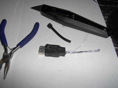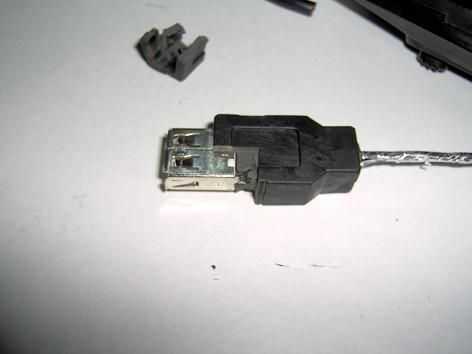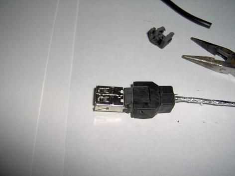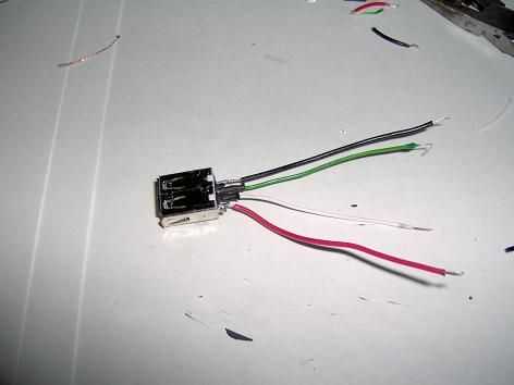 Después de esto, empiece a recortar lentamente fuera de la cubierta alrededor de la toma. usando una técnica de cuarteo, entrecruzan cortar la carcasa y suavemente (y pacientemente) sáquelo. Hacer esto hasta que tenga la toma totalmente expuesta a sus contactos de metal y alambres. Si tienes 5 cables, uno tiene demasiados. Uno es el cable de tierra y puede sujetarse apagado (este cable es desnudo y soldadas directamente a la toma de metal). Después de esto, un pequeño extremo de la tira en cada uno de los cables y un poco de soldadura en preparación para un paso posterior.