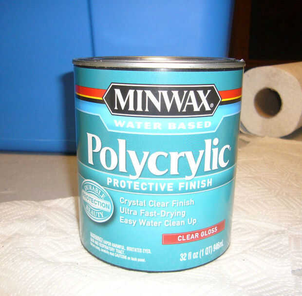 Polycrylic Minwax es un gran top coat para proteger su pedestal al baño y es muy poco olor. Apliqué dos capas de Polycrylic y lijar con lija de grano 220, antes de aplicar una tercera capa. De yapa lijar nuevamente con lija de 800 antes de aplicar una cuarta y última capa.