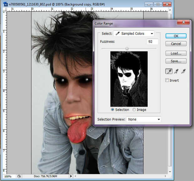 2) una vez tienes esa textura tus amigos es hora de recortar un poco la cabeza. Vamos a ocultar la capa de textura y seleccione desde el menú Seleccionar -> seleccionar el color gama. Vas a haga clic en algún lugar en la cara de la imagen de color seleccione y mueva el control deslizante hasta encontrar un lugar donde la mayor parte de la cara es lite para arriba. (5) al hacer clic en ok debe acabar con una selección de la cara.
