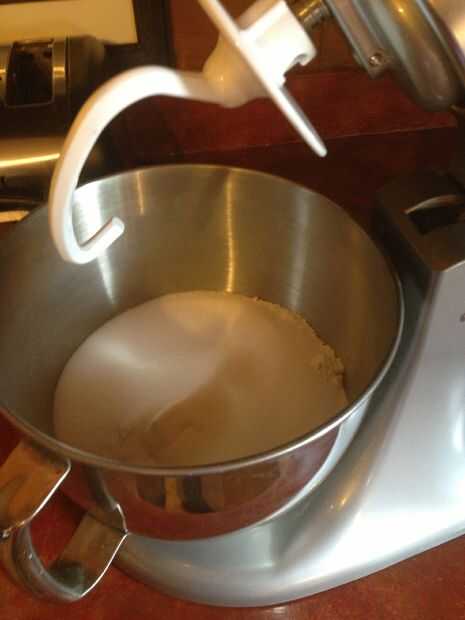 En su tazón, agregar la harina, la sal y el agua. Comience con 1 1/2 tazas de agua luego agregar según sea necesario. Terminé usando 1 3/4 de taza de esta mezcla. Siempre puede agregar más si lo necesita. Mezclar la masa durante unos 3 minutos o hasta que comienza a formarse en el tazón de fuente.
