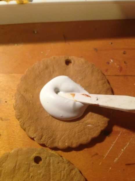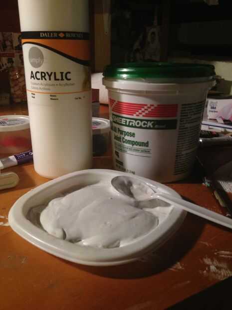 Mientras las galletas se fueron secando decidí hacer un relleno. Quería un relleno que parecía realista pero que iba a durar sin la subdivisión. Es por eso que decidí usar conjunta compuesto. Me encanta conjunto compuesto para tener siempre un recipiente pequeño de compuesto mixto listo. Si no tienes un recipiente de mezclado listo puede siempre a partir de la mezcla seca y agregar agua pero trata de no hacerlo demasiado fino. Añadí pintura blanca para el compund conjunta para hacerlo parecen relleno. Demasiada pintura resultará demasiado fino en una mezcla... así que usa sabiamente!