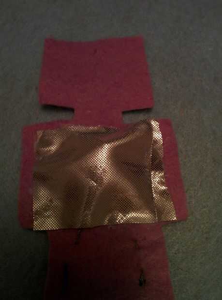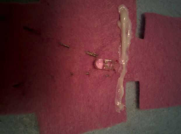 Una vez que el pegamento esté en su lugar, coloque el borde correcto del pre-corte la tela de plata encima de la cola y presione hacia abajo. Encolado, así los otros bordes y presione. La tela de plata ahora debe cubrir el LED. La tela se propagan ligeramente por el LED y esto puede causar algunas arrugas en los bordes de la tela de plata. Sus bordes probablemente no será perfectamente rectos y esto está muy bien. La tela tiene que ser capaz de formarse en una forma que acomoda el LED.