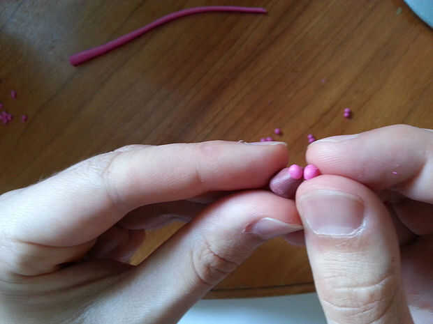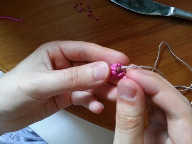 Ahora necesitas pegar bolas en pieza central. Comience por pegar en la parte inferior de la frambuesa (parte que está más alejado de la cuerda). No pongas una bola directamente en la punta del cono. Poner un poco como en la naturaleza, nada es demasiado perfecto. Seguir apilar bolas uno junto al otro todo el camino hasta la cuerda. Tenga cuidado no para granos demasiado como que resultados en aplanado de los granos, se verá lo que estoy hablando de si se mira por fin imagen de este paso. El resultado aún se ve muy bien aunque!