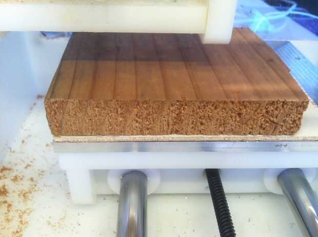 - Cubrir un lado de uno de sus 3 "x 3" x0.102 "piezas de madera con cinta de doble cara y adhiéralo a la zona de corte de la Othermill. Asegúrese de que la esquina izquierda delantera de la madera está alineada con la esquina frontal izquierda del área de corte de la Othermill. Esta será la capa de sacrificio y proteger la zona de corte.