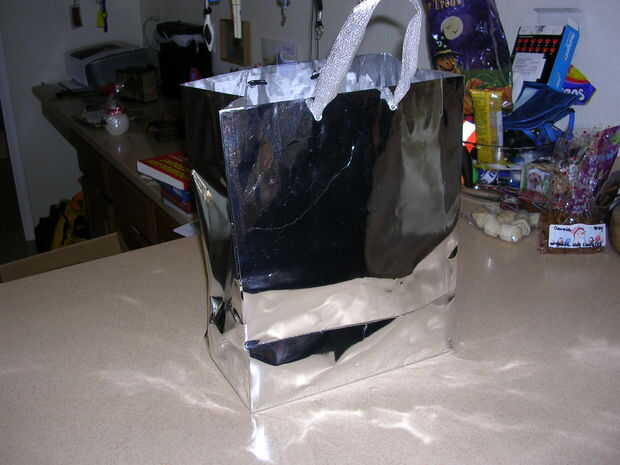 Primero Búscate un medio para bolsa de regalo tamaño grande. Prefiero utilizar los metálicos para este adorno, pero puede utilizar cualquier bolsa.