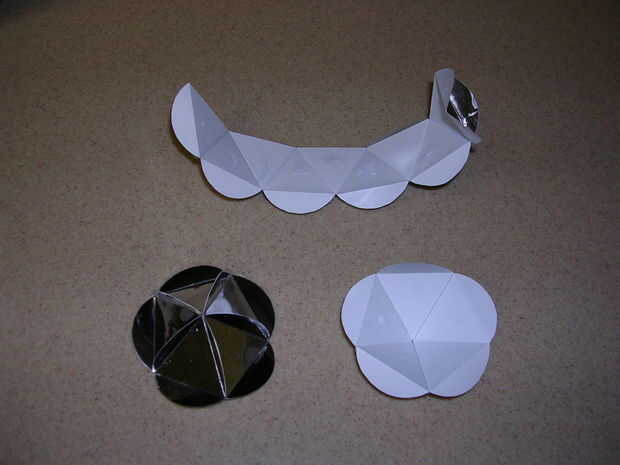 Ahora es el paso donde empezar a pegar los círculos. En primer lugar hacer un tren de 10 círculos pegando los bordes plegados juntos. Luego hacer 2 'sombreros' de 5 círculos.