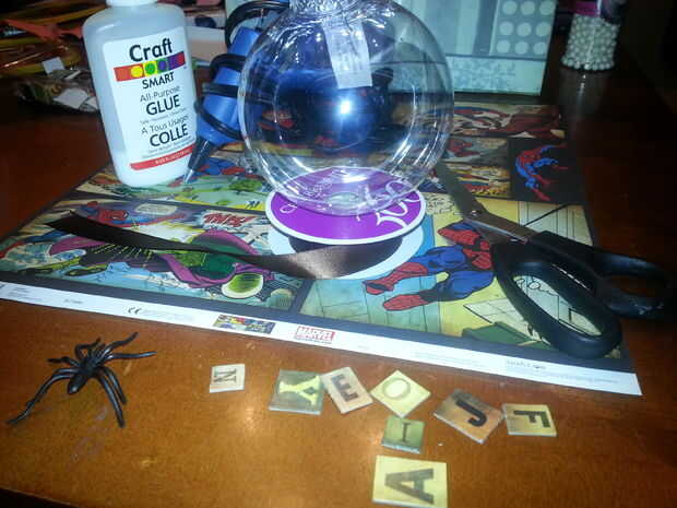 -Ornamento plástico claro -Página cómic o libro de recuerdos de los cómics de Spider-Man -Cinta. He usado marrón y luz azul -Las letras cartón pequeñas -Perforadora -Tijeras -Pistola de pegamento caliente -Araña plástico -Pegamento escuela