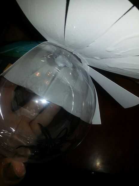 La araña plástica debería poder suficiente se puede tomar la parte superior del ornamento y deslice en la flexión. Vuelva a colocar la cubierta. Seguir adelante y saturar la parte posterior de su papel a una mezcla de pegamento y agua. Sólo utilice una parte por una parte de agua. Un pincel puede hacer esto más fácil. Luego deslice el orificio central sobre la parte superior de su ornamento. Lisa hacia abajo las aletas de papel. Puede tener que se superponen. Iniciar el cepillado en la mezcla de pegamento en la parte superior del papel. Tenga cuidado de no gotear. Déjelo secar.