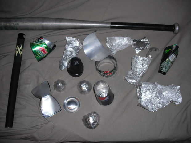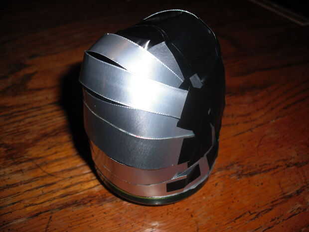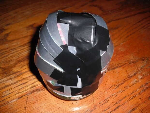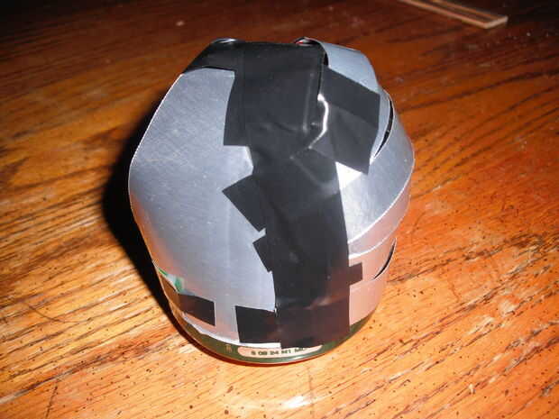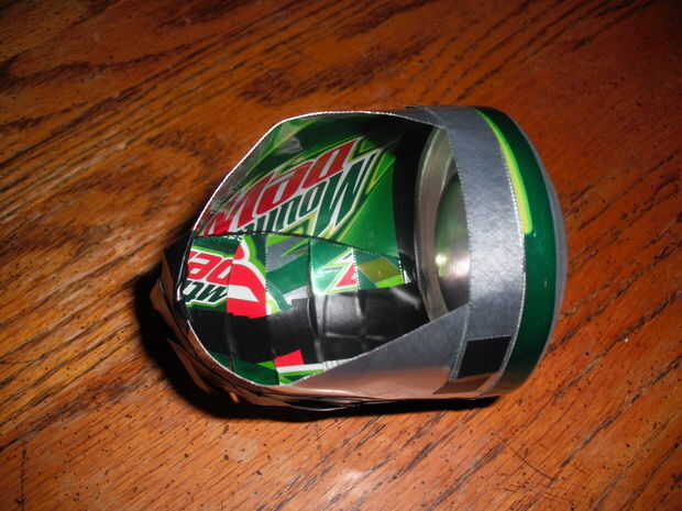 La solución que se me ocurrió estaba usando la parte inferior dos de latas del estallido, con aproximadamente un cuarto de pulgada de la parte izquierda. Eso me dio una base circular y algo para comenzar con. Luego corté dos piezas laterales, que podían ser doblados en un círculo y conectados en la parte superior con una tira delgada que el diámetro de una tapa de la botella. Permitió a ambos lados para la curva, manteniendo la parte superior conificada en. Usé la segunda inferior se deslice dentro del cuerpo y la verdad la escalera exterior a la otra puede hacer circular. Que se hizo cargo de la parte delantera y trasera, luego hice las costillas de las franjas de fino corte que os adjunto en la parte delantera y posterior del cuerpo hasta la parte superior. Me hubiera gustado que estos han pegado abajo, pero debido a tiempo para el concurso sólo inmovilizarlo cinta aislante.
