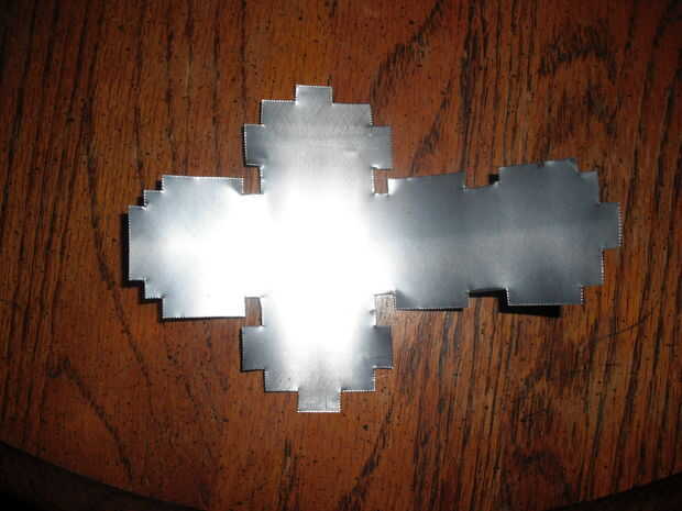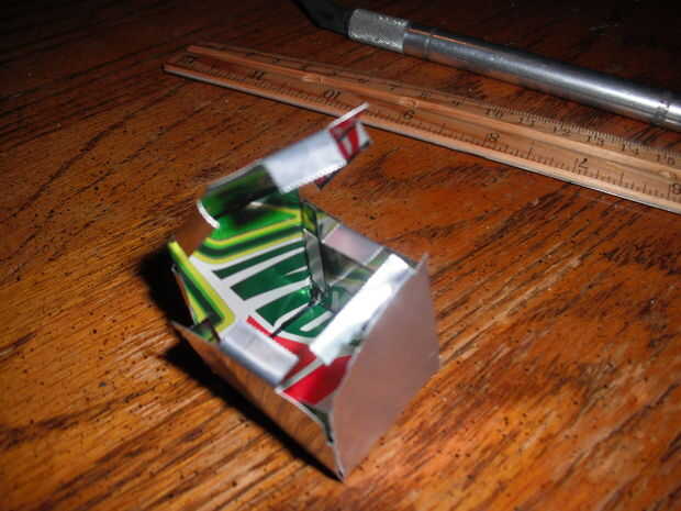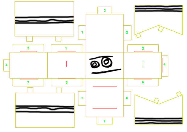 Debo señalar que la cabeza del Robot es ligeramente rectangular y no un cubo verdadero. He diseñado una plantilla para crear el cubo con fichas y lugares para las ranuras para cortar. Cuando mi diseño era un poco demasiado grande, yo solo saqué uno a mano que estaba bastante cerca. La ranura final terminó siendo demasiado largo, por lo que recortan de nuevo y cortar una nueva pestaña en el extremo. La primera foto es de la plantilla que he creado, y cuadros posteriores son de la cabeza real de construcción. Mucho como un avión de papel más exacta los pliegues, que se ajusta mejor (y estancia) juntos.