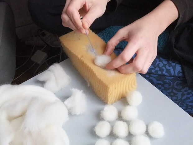 Corte una 1-1/2 '' a 2'' (4-5 cm de) longitud de mecha de lana blanca y dividirla en dos. Con cada pieza, forman aproximadamente una bola al unir los extremos. Piquetes con la aguja de fieltrar, vuelta la bola a cada lado y asegurarse de que no conseguir unido a la espuma. Rollo el pedo de lobo entre las manos de vez en cuando y seguir empujando hasta que estés satisfecho con la forma. Mi snowbabies terminan bastante hinchada, con esta cantidad de lana de mecha, apenas los suficiente para unir, felting terminan siendo 1" a 1-1/2" (2.5-4 cm) de diámetro, pero si quieres snowbabies más denso, más lana para cada bola y poke para ya.