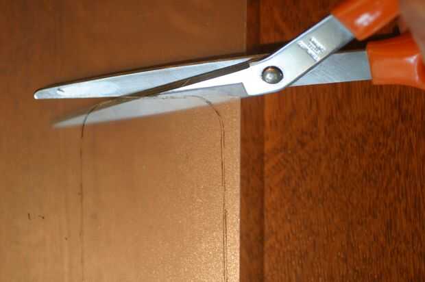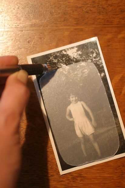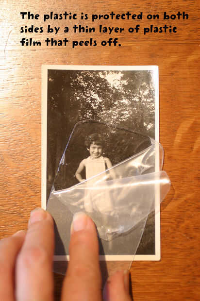 Utilizando la lata Altoids como una plantilla, trace una línea alrededor de tu foto y el plástico también. Corte ambos. Saque la fina cubierta en ambos lados de la "ventana" de plástico protectora de plástico.