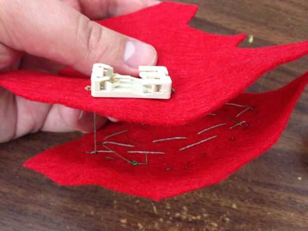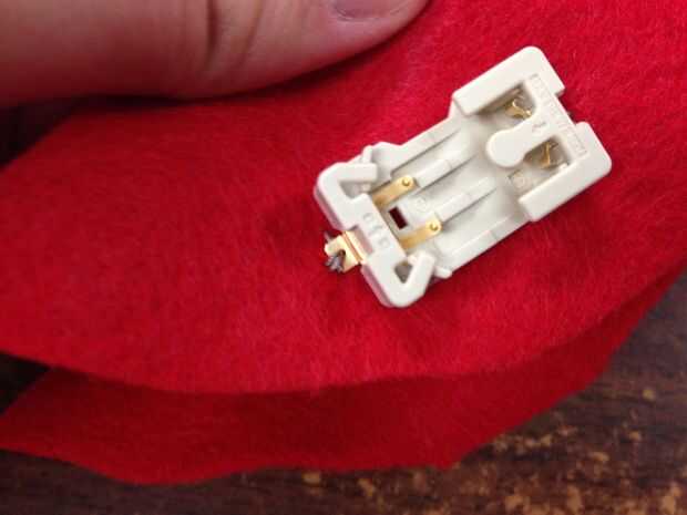 La batería va en la parte posterior de la ornamentación en la segunda pieza roja de fieltro.