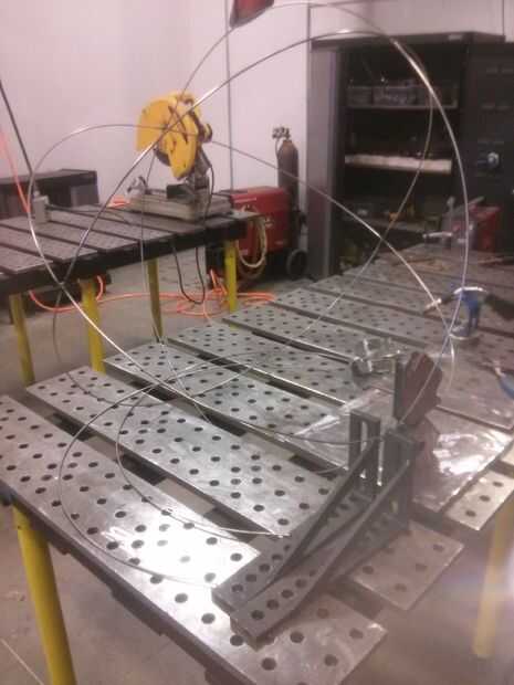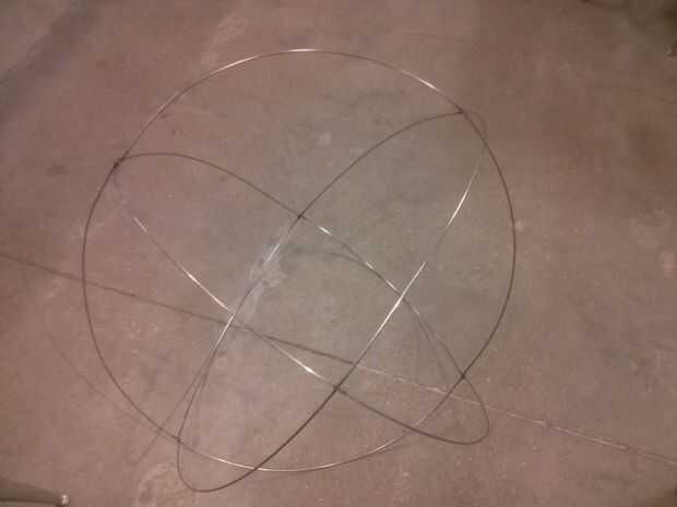 Usando el soldador MIG y alambre de acero, soldadura 2 mitad circunda en un círculo completo de colocación en el Banco de soldadura y soldar las puntas de los semicírculos juntos. Luego suelde otro medio círculo perpendicular al círculo en el Banco. Soldar el otro medio círculo en el lado opuesto de eso y ahora tienes dos círculos completos, soldadas con autógena juntas. Después de soldar los dos últimos medio círculos alrededor del Ecuador de los dos círculos completos para aumentar la fuerza de la estructura y completar la forma del globo.