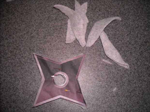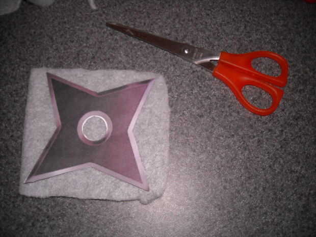 Imprimir tu estrella ninja y recortado, incluyendo el círculo en el centro y pin en el vellón gris o sentía que usas para que no se mueva mientras está tratando de cortar hacia fuera. Mi primera de ellas fue impresa en un pedazo de papel que era 7" por 5", y el segundo fue en una pieza que fue 8" por 10". Que fue impreso en un 8" por 10" pedazo de papel era mucho más fácil de coser y cortar. Además, no parece como extraño al final.