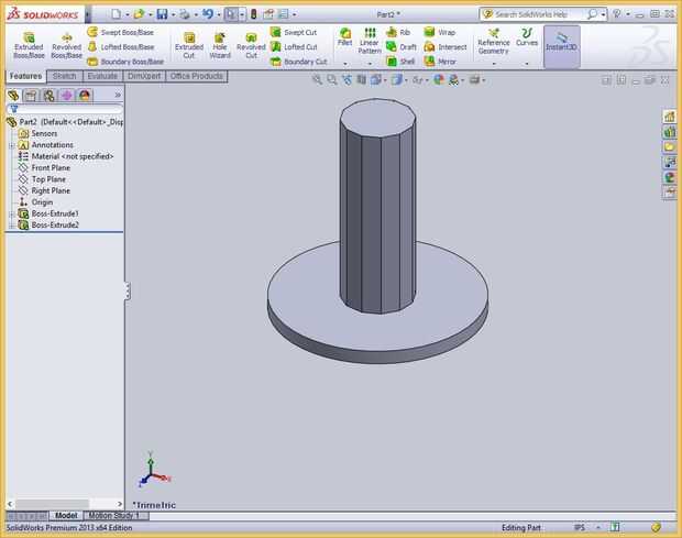 Inicio de Extruyendo un 0.6 en círculo de diámetro.05 en hacia arriba desde el centroide en el plano superior. Traza un polígono de 12 lados centrado sobre este disco, de tamaño para que un 0.25 en círculo cabe dentro. Restringir un lado ser vertical, esto Oriente correctamente el polígono. Saca esto para ser 1,2 pulgadas de alto.