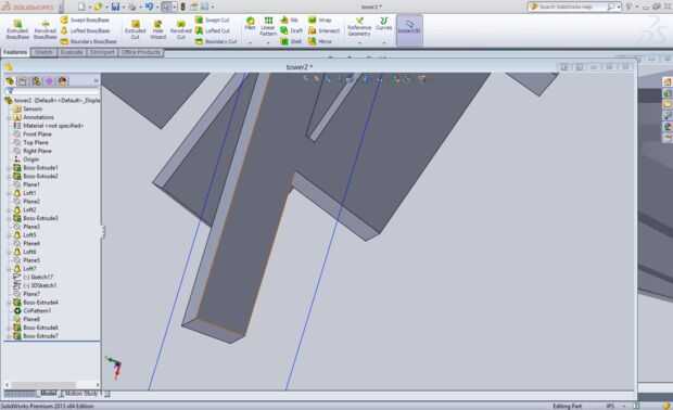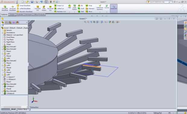En este paso, vamos a hacer los picos que rodean la plataforma de observación. La primera parte de esta es un poco complicada. En primer lugar, en el plano frontal, trazar una línea hacia abajo desde el anillo muy externo del borde inferior. Ponerlo en vertical, esto le permitirá medir su ángulo. A continuación crear una línea que baja desde el mismo punto, lo que es de 15 grados en sentido horario desde la primera línea. La siguiente línea que usted tendrá que hacer será un 3d bosquejados línea sobre el plano yz perpendicular y conectado a la línea inclinada. Después de esto crear un plano coincidente de los dos extremos de la línea de ángulo y el punto final de la línea esbozada 3D. Esbozo de un cuadro de 0.03x0.015 centrado en el mismo punto donde las líneas en el plano frontal toquen el borde de la plataforma de observación y para sacar a 0,25 pulgadas. Crear un patrón circular con 24 de estos con un borde circular. Para acabar estas espigas, crear un plano en el extremo superior de las espigas. Ello mediante la creación de un plano paralelo al plano superior y coincidente a la punta superior de la espiga. A continuación cree un cuadro de 0.11 pulgadas de largo obligados a ser el mismo ancho que la espiga, "equilibrio" en su punta con 0,05 pulgadas colgando más allá de la punta de la modelo. Sacamos este 0,015 pulgadas hacia arriba y 0,003 pulgadas hacia abajo. La extrusión hacia abajo voluntad esto dar más fuerza. Crear un patrón circular con esto sacan como lo hizo con los picos.