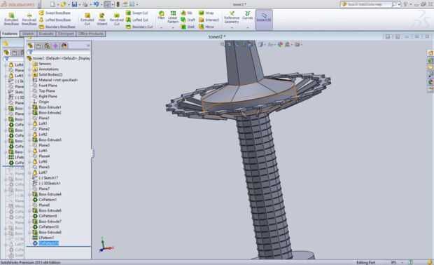 La torre de oración tiene ventanas hacia abajo la columna inferior, aquí es cómo hará. Escoger cualquiera de las caras en la columna de 12 lados y dibujar un 0.01x0.05 en caja. Establecer el cuadro de 0.01 en de la base y el centro usando el truco del punto en el último paso. Saca 0,075 pulgadas y el borrador 3 hacia adentro grados. Crear un patrón lineal de la columna con conjunto de 24 copias separada 0,05 pulgadas aparte. A continuación hacer un patrón circular del patrón lineal, con 12 ejemplares: uno para cada lado.